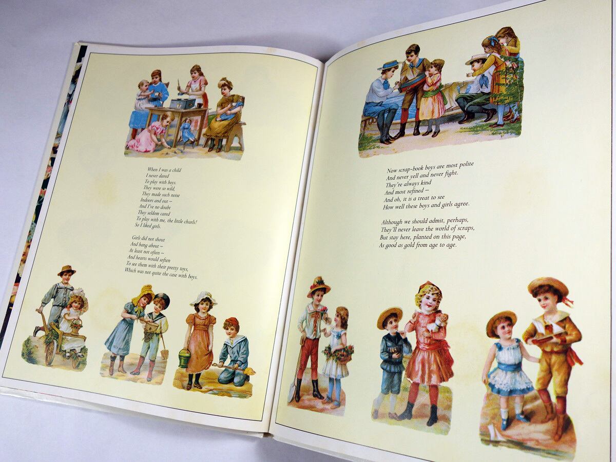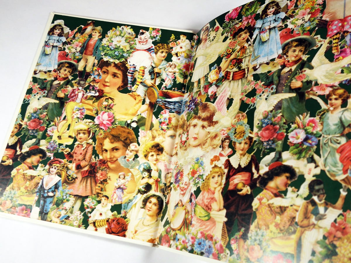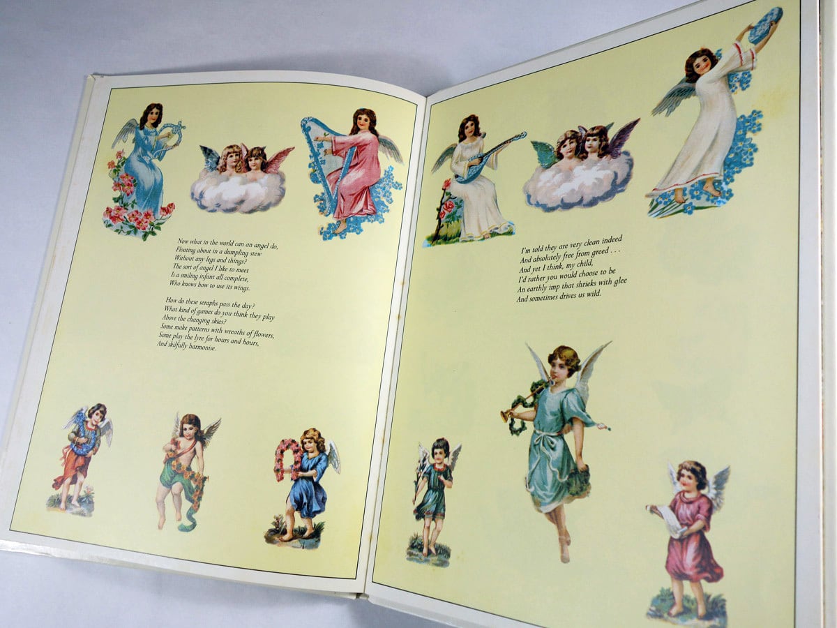 本書は、米国の女性ファッション史家、ドリス・R・ムーアが個人的に蒐集したドイツ製の「クロモス」をコラージュし、天使、子供たち、鳥、動物、草花など、それぞれの絵柄に合わせた詩を添えて編集されたもの。多くのページにシミが見られますが、とても絵が美しいのでおすすめしたいと思います。