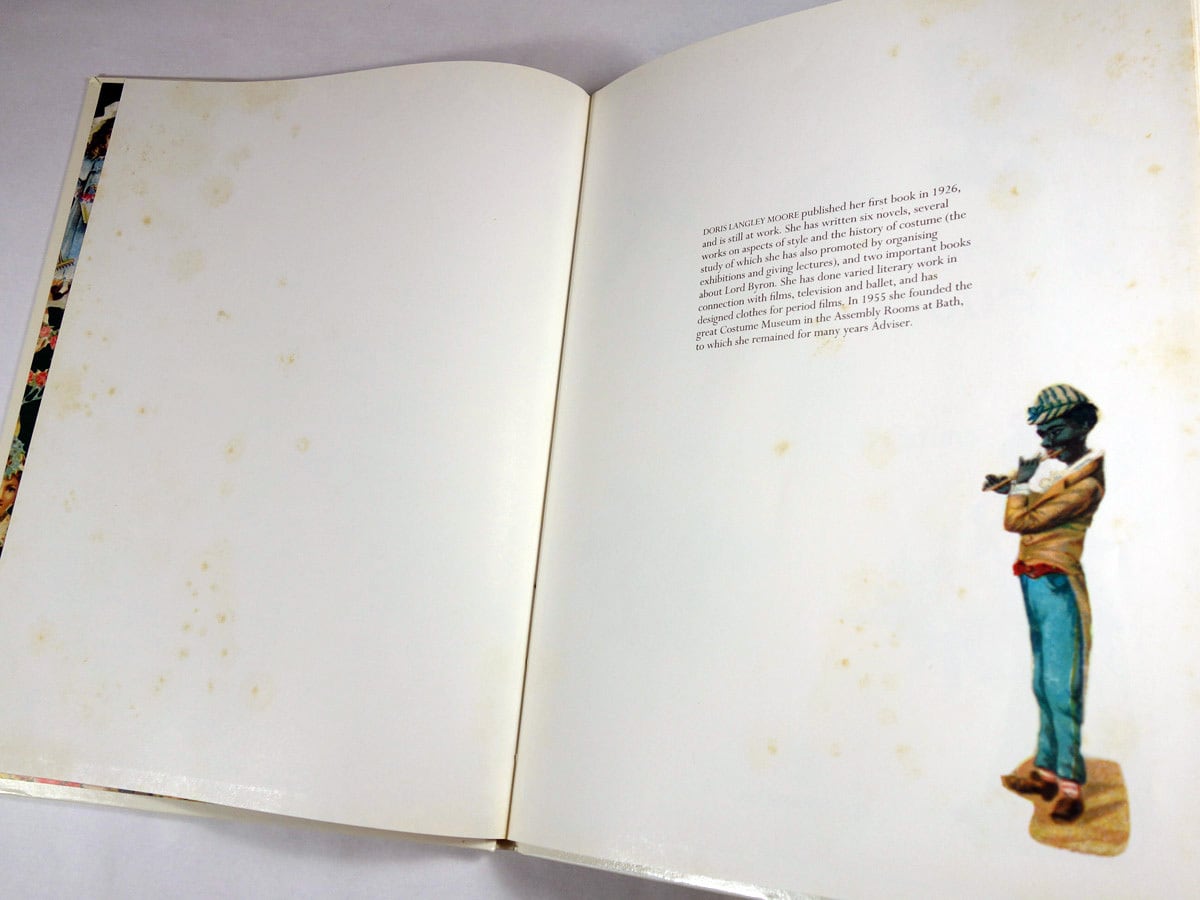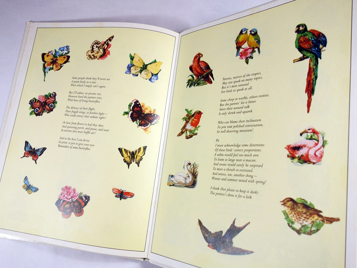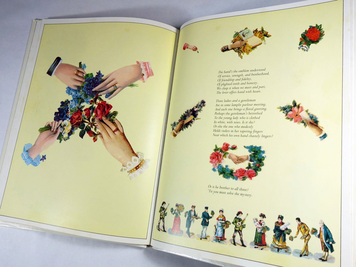 本書は、米国の女性ファッション史家、ドリス・R・ムーアが個人的に蒐集したドイツ製の「クロモス」をコラージュし、天使、子供たち、鳥、動物、草花など、それぞれの絵柄に合わせた詩を添えて編集されたもの。多くのページにシミが見られますが、とても絵が美しいのでおすすめしたいと思います。