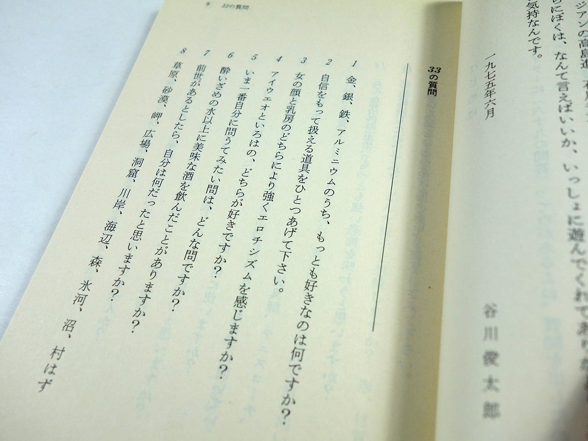 谷川俊太郎が〈33の質問〉を作り、吉増剛造、岸田今日子、和田誠ら7名、そして自分自身に問いかける対談集。