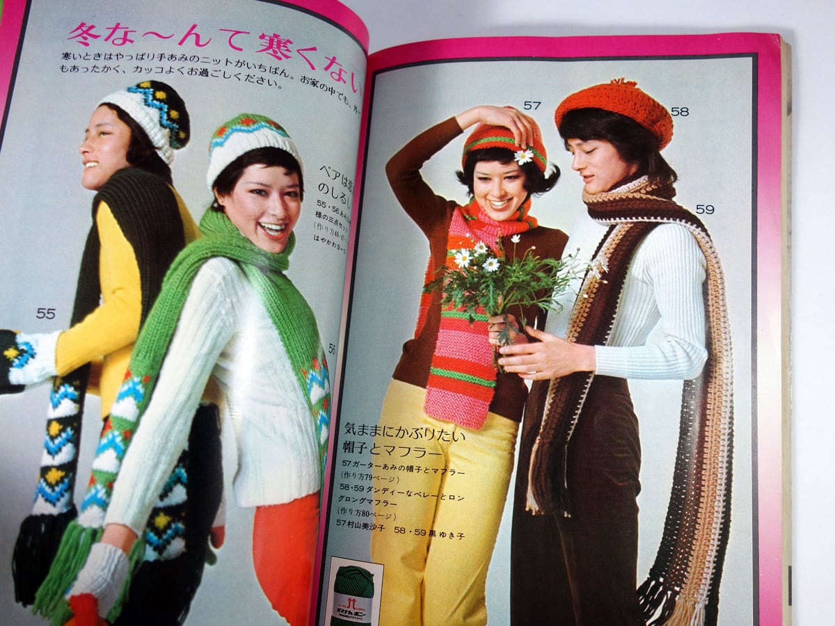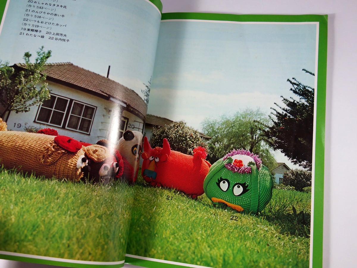 毛糸の特性を生かしたかぎ針棒、針編みによるカラフルなモチーフ編みのクッションカバー、ベッドカバー、ルームシューズ、ニット帽、マフラー、ミトン、三角ショールなど多彩な作品を収録しています。1970年代らしいスタイリングのインテリア写真も魅力。