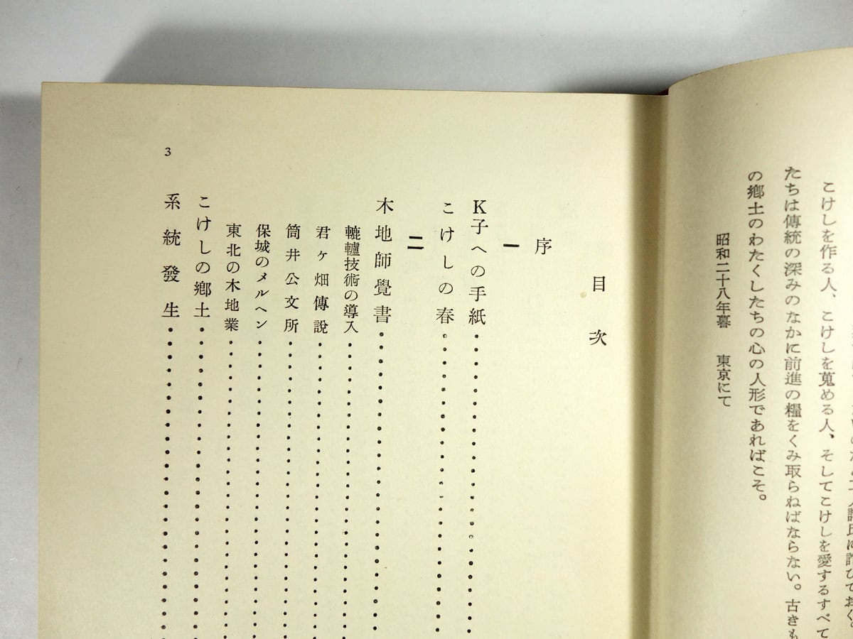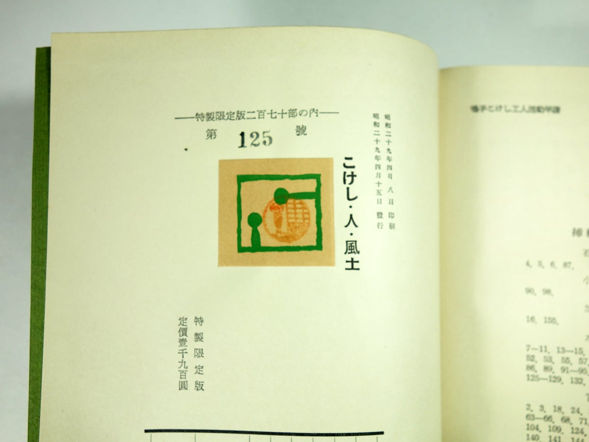 こけしの歴史や産地への旅、各工人(こけし職人)の人となり、系図などが掲載されており、工人年譜、各地工人表、書誌など、巻末資料も豊富。日本を代表的する工芸家芹沢銈介が装幀を手がけており、すみずみまで美しい豊かさに満ちた本(特製限定版)となっています。