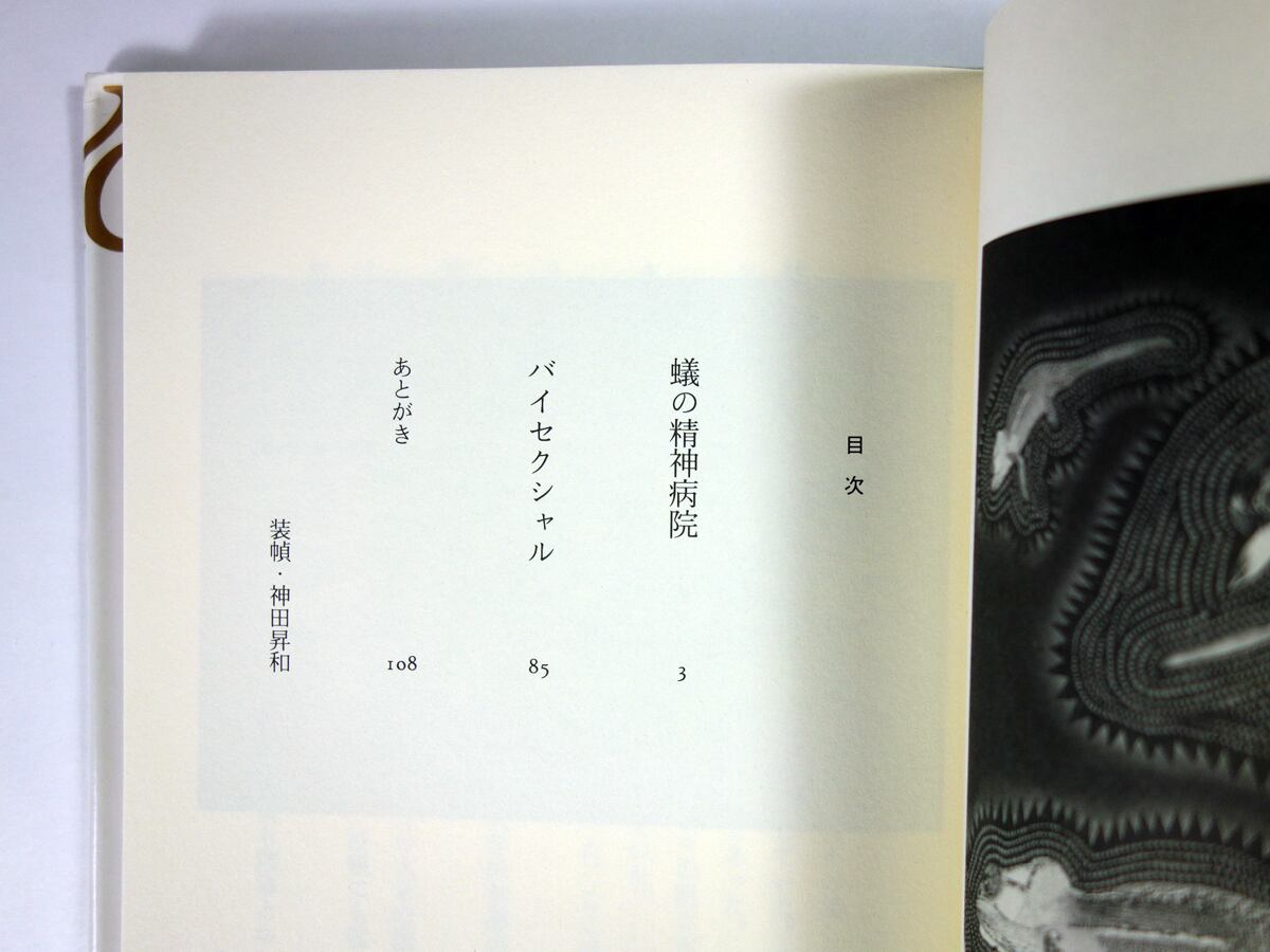蟻たちが暮す欅の大木をくりぬき、その中に作られた精神病院を舞台に、寓話的な世界が展開される中編「蟻の精神病院」、ニューヨーク在住の一人の女性の生と性を素描する短篇「バイセクシュアル」を収録した小説集。1994年に発表されたコラージュを挿絵として使用しています。
