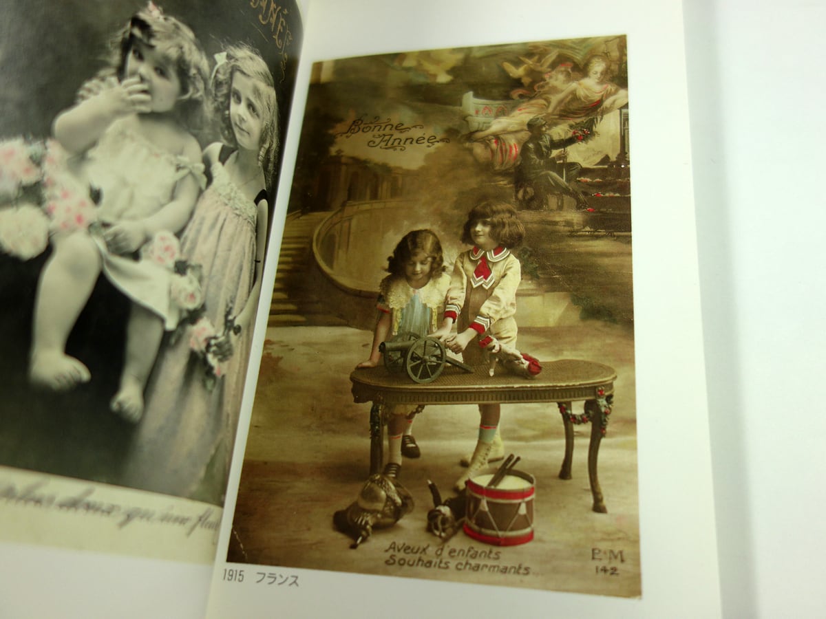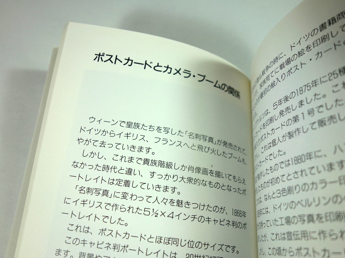「ポストカードのルーツは「名刺写真」?」「ポストカードとカメラブームの関係」「ポストカードは着色写真がベスト」「セピア色の天使にささげるあとがき」の4つのコラムを掲載。また、ポストカードに記された文面の翻訳も掲載されており、当時の人々の想いがリアルに伝わってきます。