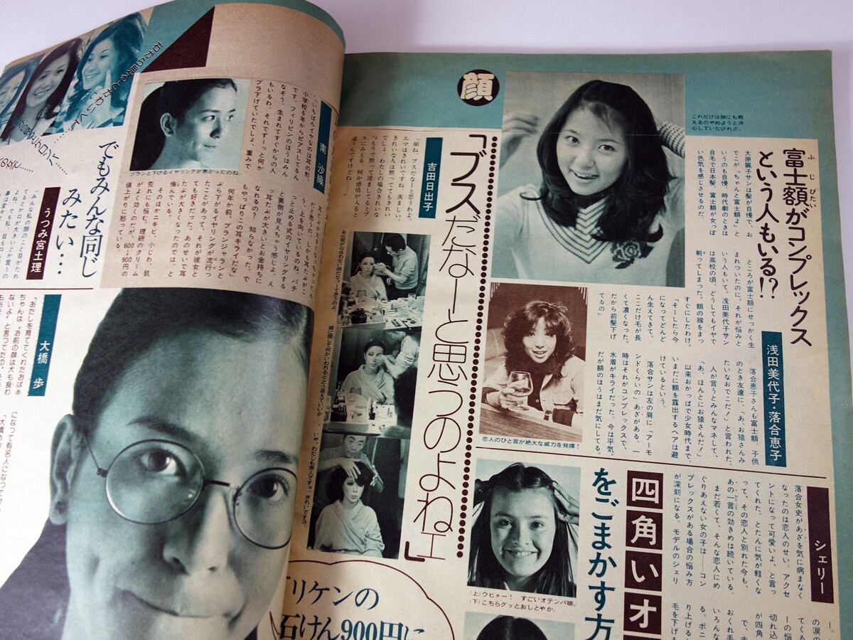 「TOPICS:スター/人気モデルの肉体コンプレックス」では、南沙織、岩下志麻、大原麗子、浅田美代子、リンリン・ランランなど、20人の悩みを大公開。ちなみに、安井かずみ、山口小夜子は「コンプレックスなし」とのこと。