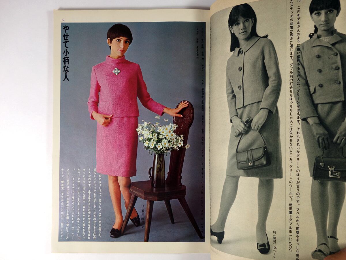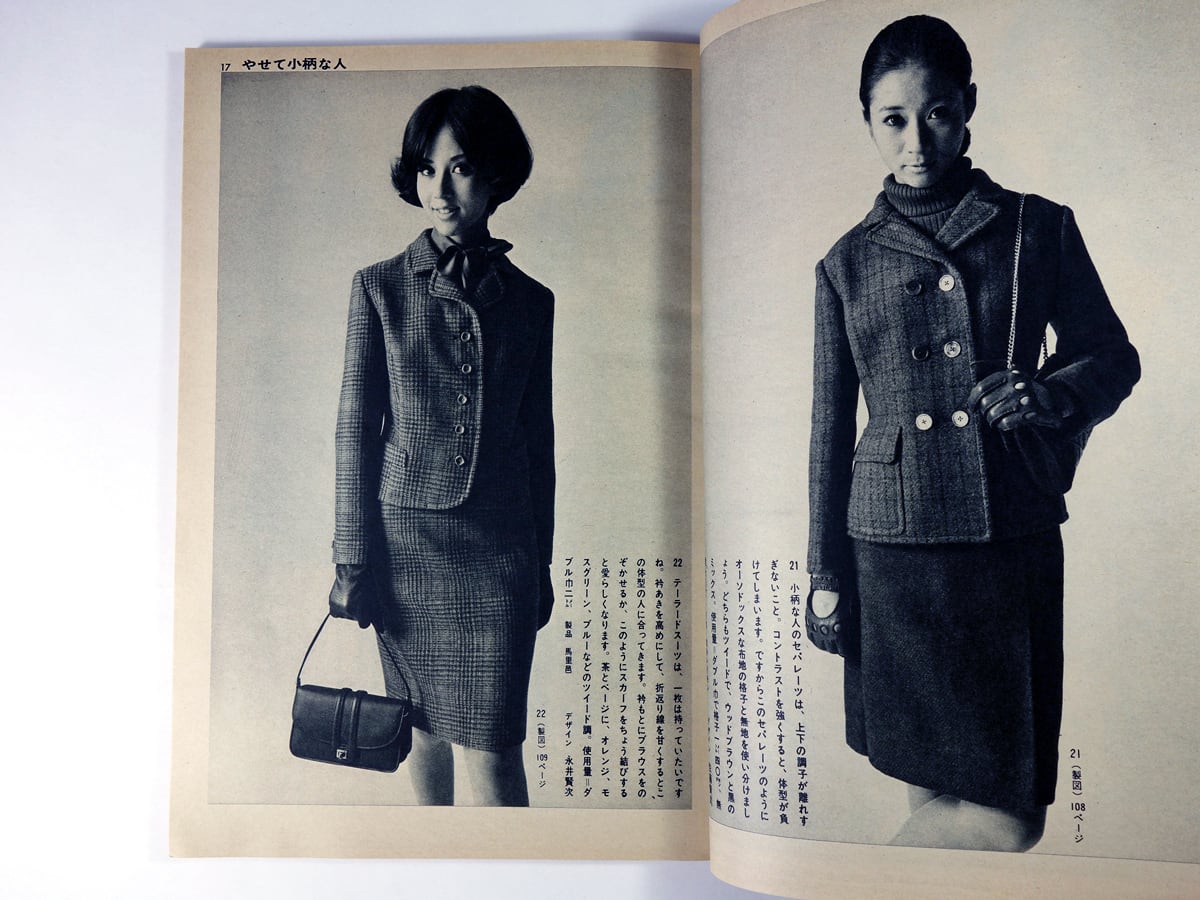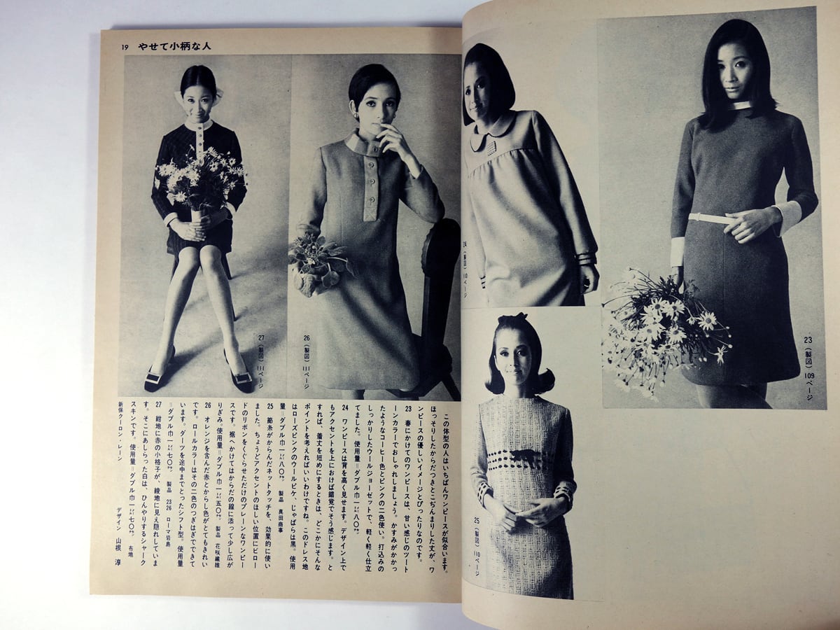 1936年に洋裁専門誌として創刊以来、日本のファッション誌の先駆的存在であり続けてきた「装苑」の60年代の別冊付録。「細くて背の高い人」「やせて小柄な人」「大柄の人」「小柄でふくよかな人」の4つの体型別のデザインが掲載されています。モデル 丘ひろみ、青木エミほか。
