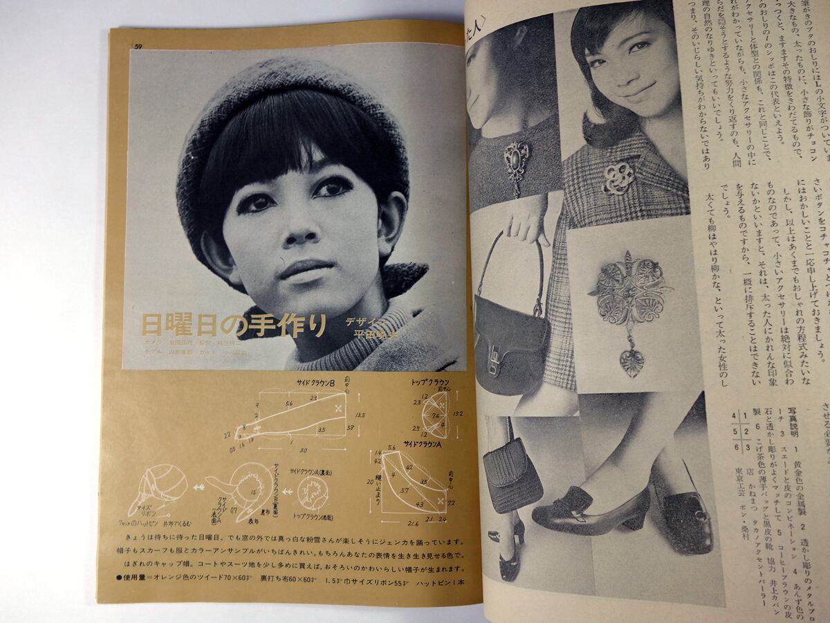 中村乃武夫による体型別の生地選び、デザイン、コーディネートのポイントなどの読み物、平田暁夫による帽子デザイン「日曜日の手作り」、コラム「私のおしゃれ法」鳥居ユキ、本文カット長新太など。