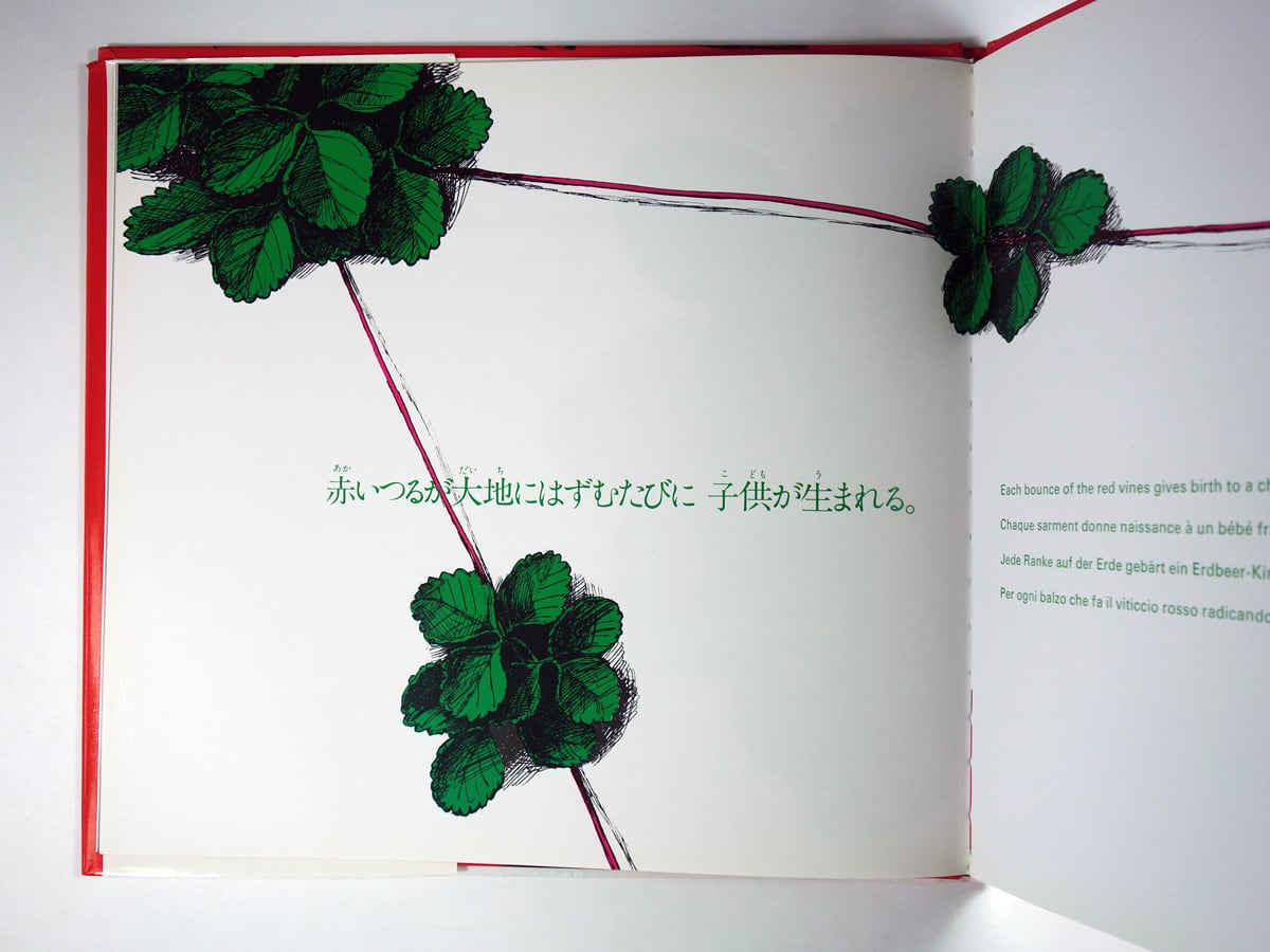 一粒のいちごの一生から、宇宙の果てまで喚起されるイメージで、大人も楽しめる絵本。シンプルかつ大胆にレイアウトされた絵に、情緒に流されない抑制をきかせた一行が添えられ、英、仏、独、伊の訳文が掲載されています。