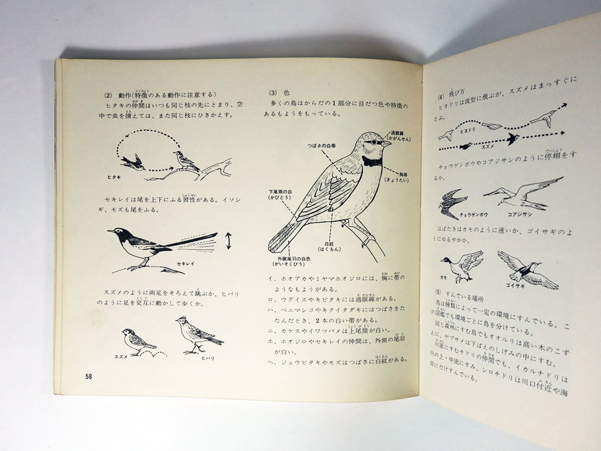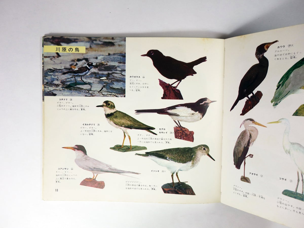 本書の前半のオールカラーページは、すべて生態写真か標本を撮影したもの。巻頭に「世界でも初めてのオールカラー写真による鳥類図鑑です」と誇らしげに記されています。後半のモノクロページでは、鳥類に関する話題が幅広く取り上げられており、子どもだけでなく、大人も面白く読める「科学エッセイ」となっています。