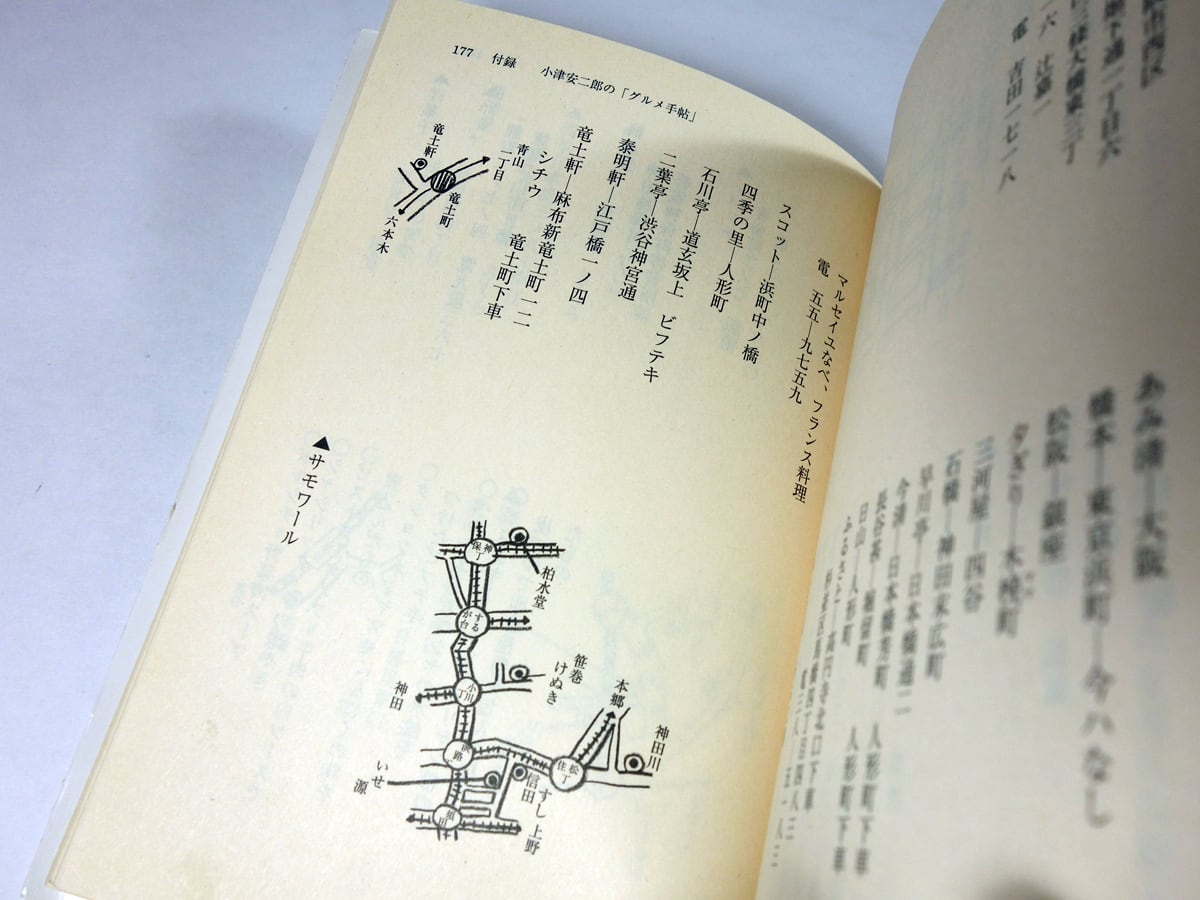 本書は、本人が残した通称「グルメ手帖」と呼ばれる二冊の手帖と、日記を資料として、小津安二郎が愛した「東京の味」を紹介する本。小津の手書き地図を含む「グルメ手帖」の内容全文が付録として掲載されています。