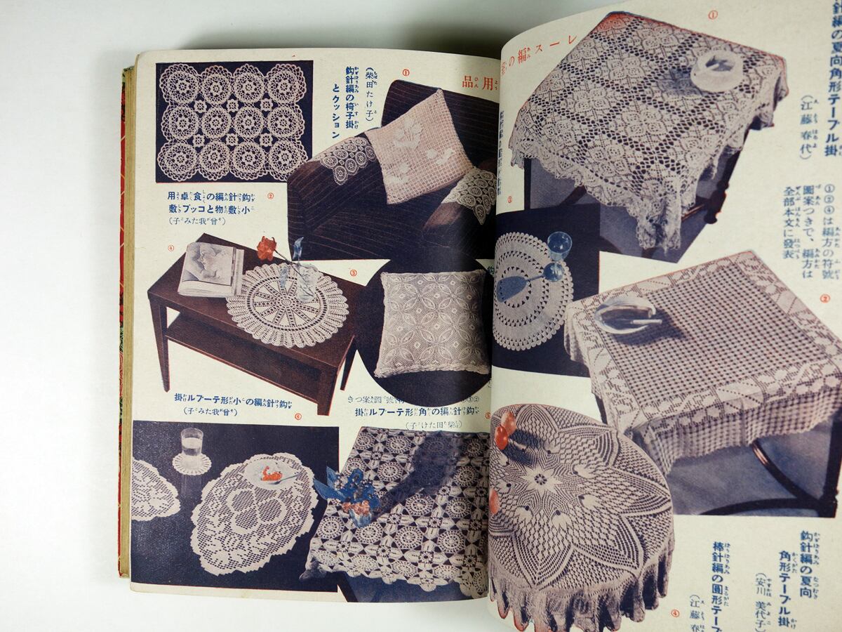 本書のテーマは、「毛絲編とレース編」。本編は1色刷ですが、巻頭にカラーページがあります。女優・桑野通子さんのセーター姿も。婦人服から、紳士服、子供服、赤ちゃん服まで。レースカバーなどの小物に彩られた応接間なども見られますが、実際的にはまだ和装なども多かった当時は、このような住宅環境はごく一部だったのでしょうね。付録として、「図案集」の大判型紙がつけられています。