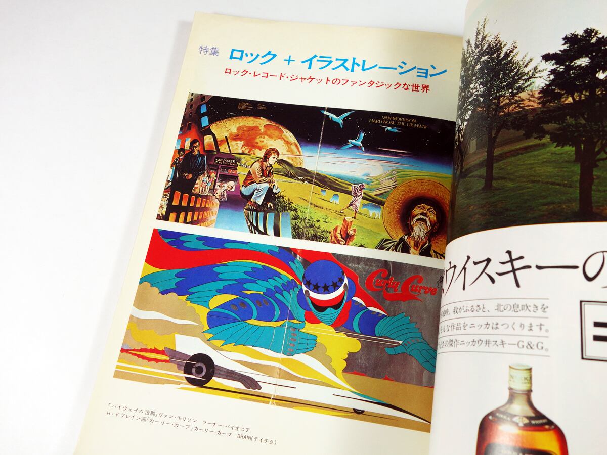 この号の特集は「ロック+イラストレーション」。巻頭カラーページに、ロジャー・ディーン、横尾忠則ら、当時の先鋭的なイラストレーターが手がけたロックアルバムのジャケット22作品を掲載。美術評論家・石崎浩一郎が、ロックとアートの関係を論じています。