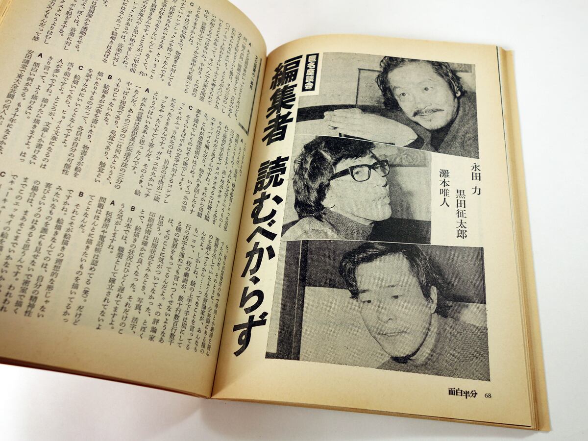 雑誌『面白半分』(1972年創刊/1980年廃刊)は、70年代の文学系サブカルチャーマガジン。6ヵ月交代で人気作家が編集長を務める、斬新なスタイルを取っていました。