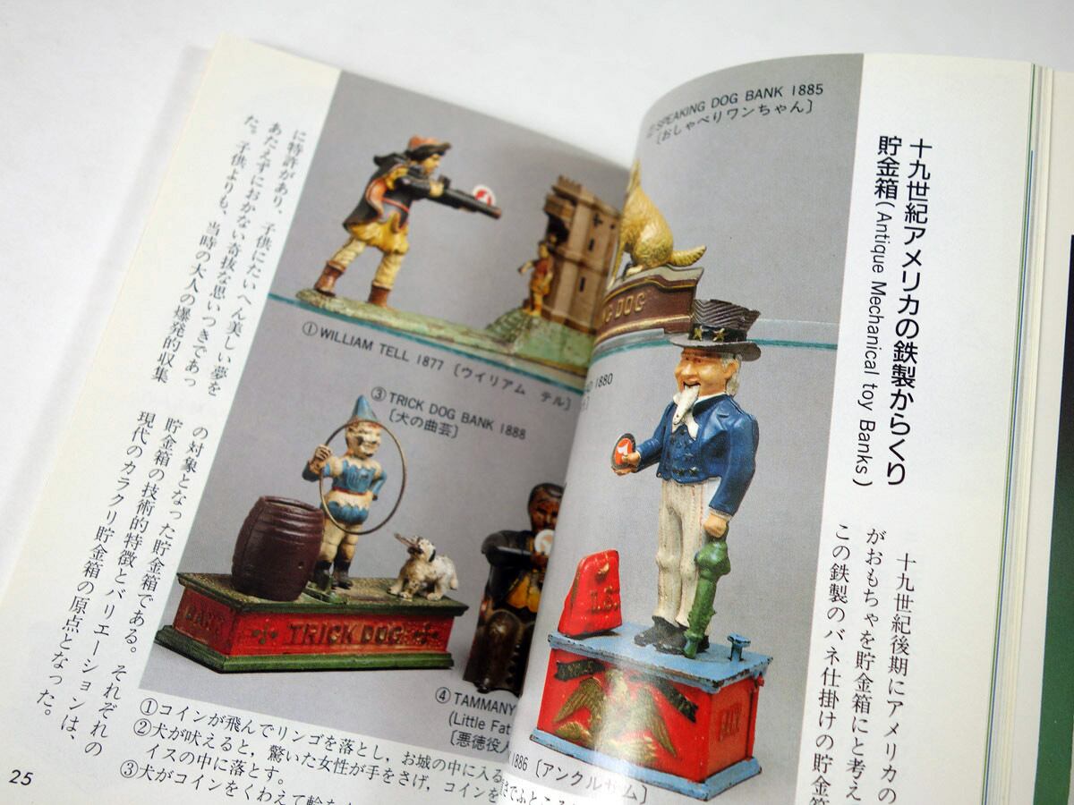 たとえば、表紙の貯金箱は「19世紀アメリカの鉄製からくり貯金箱」。虫歯を抜いた勢いで歯医者と患者がひっくりかえり、ポケットのコインが穴に落ちる仕掛けになっています。