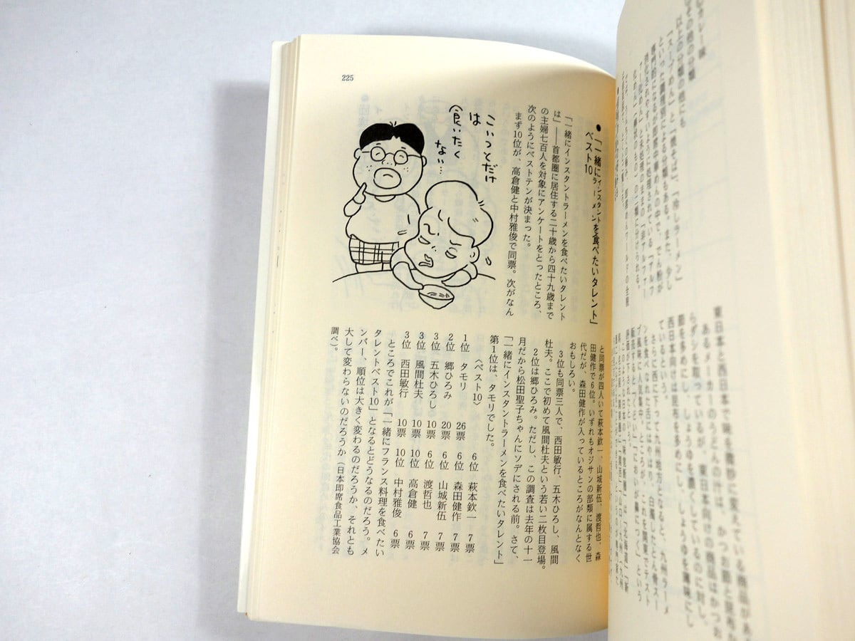 嵐山光三郎が6日間インスタントラーメンのみを食べ続け、101種類の味をレポートするという、身体をはった無茶な企画も……。エッセイ、小説、俳壇・歌壇などのほか、インスタントラーメンの発展史、当時発売されていた銘柄のメーカー名・価格・特徴を列挙したリストなど、資料も充実しています。