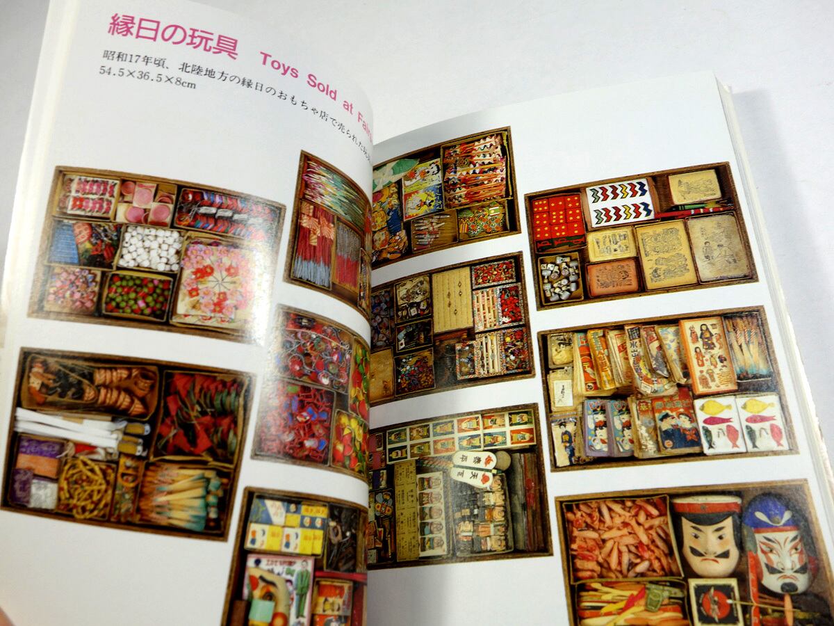 本書の30ページから89ページに掲載されている縁日の玩具は、昭和17年頃、東北地方の露店商の方が所持していた物で、11段重ねの木箱を縁日に持って行き、そのまま並べれば店を開く事が出来る状態で保存されており、おそらく当時の縁日の玩具の実態を完全な形で見る事が出来る、唯一の資料であろう。