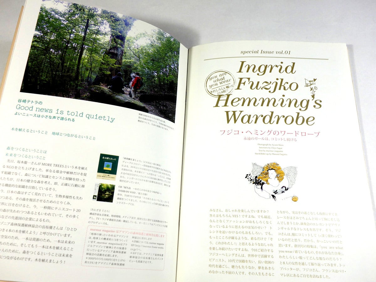 服部みれいを編集長として、2008年に創刊されたオーガニックライフスタイル誌「murmur magazine」。ファッションブランド FRAMeWORK の季刊PR誌として13号まで発行され、14号以降は版元を移して不定期刊行されています。