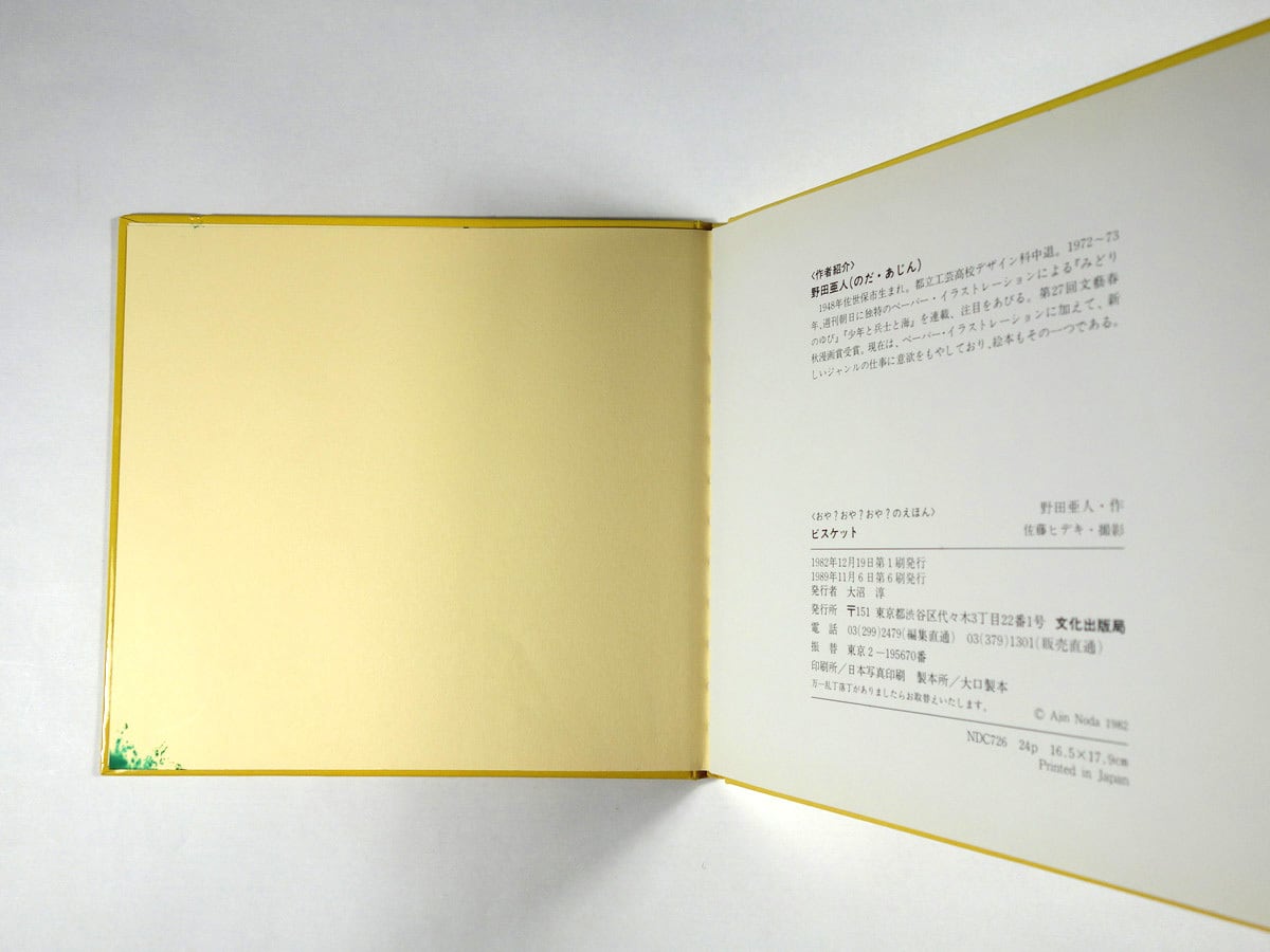 ペーパークラフト・イラストレーター野田亜人が「ビスケット」を素材に使って作り上げた楽しい写真絵本。カラフルな背景色を配して、ポップアート的なセンスでまとめられている。「ミセスこどもの本」シリーズから。