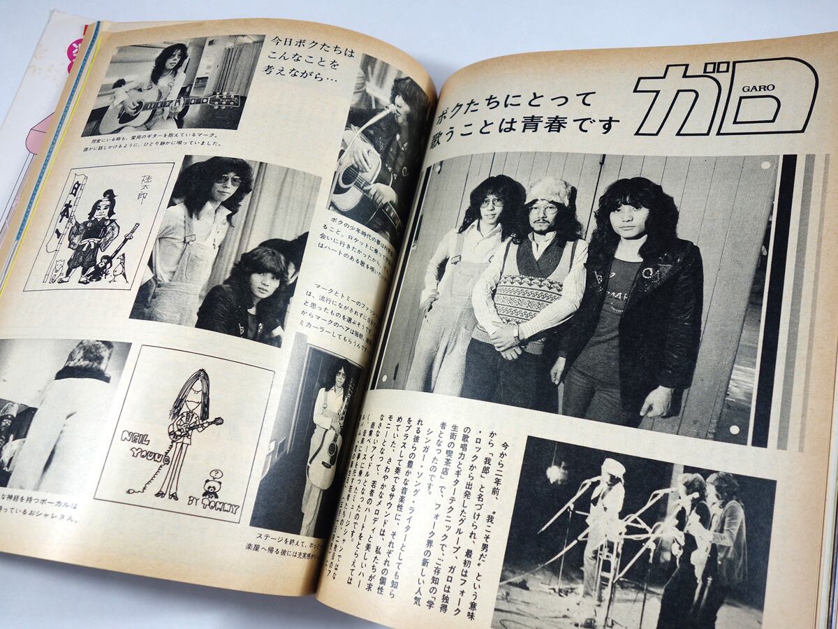 フォークグループ「ガロ」の取材記事、浅井慎平や松山猛のエッセイなど、読み物ページも充実している。