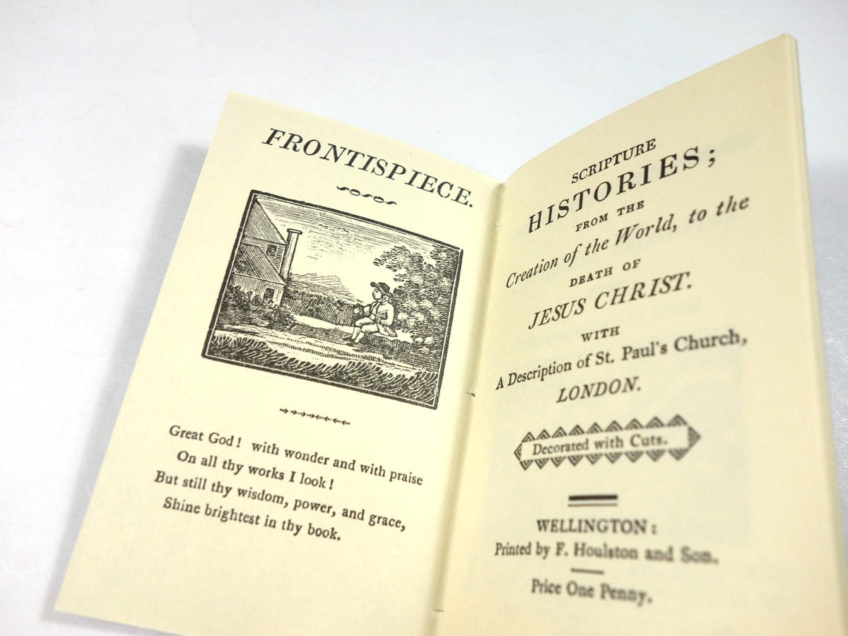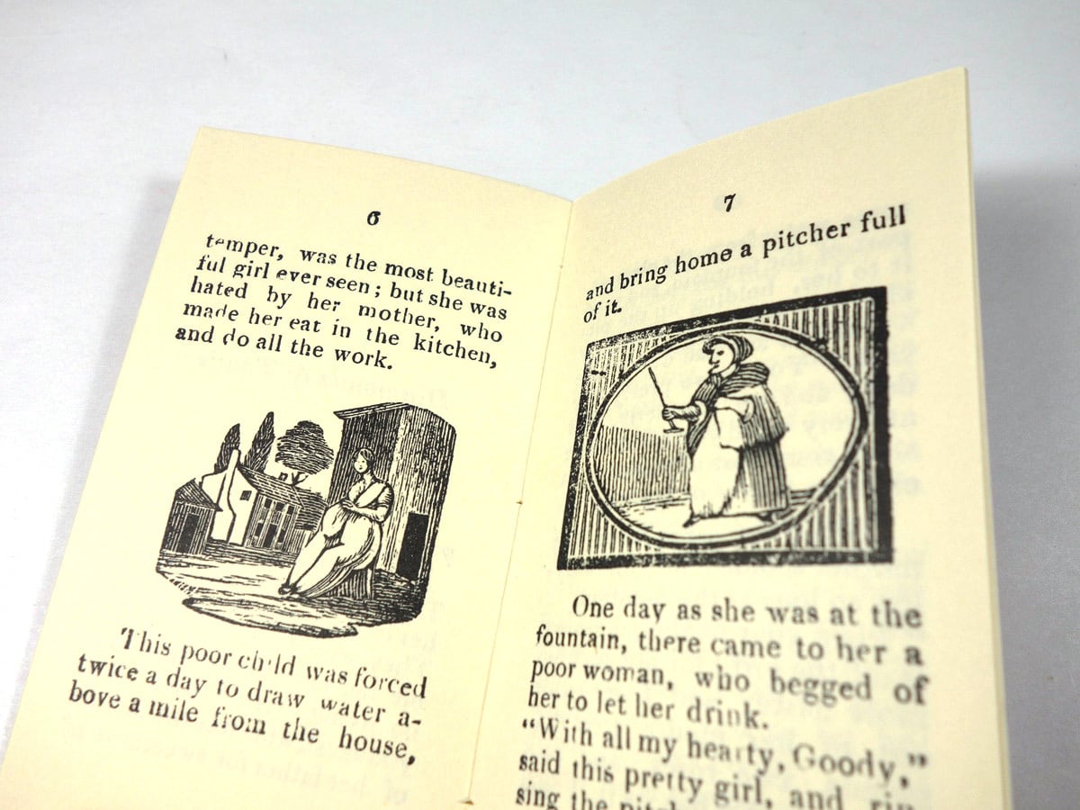 18〜19世紀にチャップマンと呼ばれる行商人が売り歩いた「チャップブック」(一枚刷りの粗末な小型本)から、シャルル・ペロー作の『ダイヤモンドとひきがえる』ほか、『聖書のおはなし』、『ジャックとジルとギルおくさん』の3冊を1組としたもの。見れば見るほど、手のひらサイズの絵本の世界に引き込まれる。