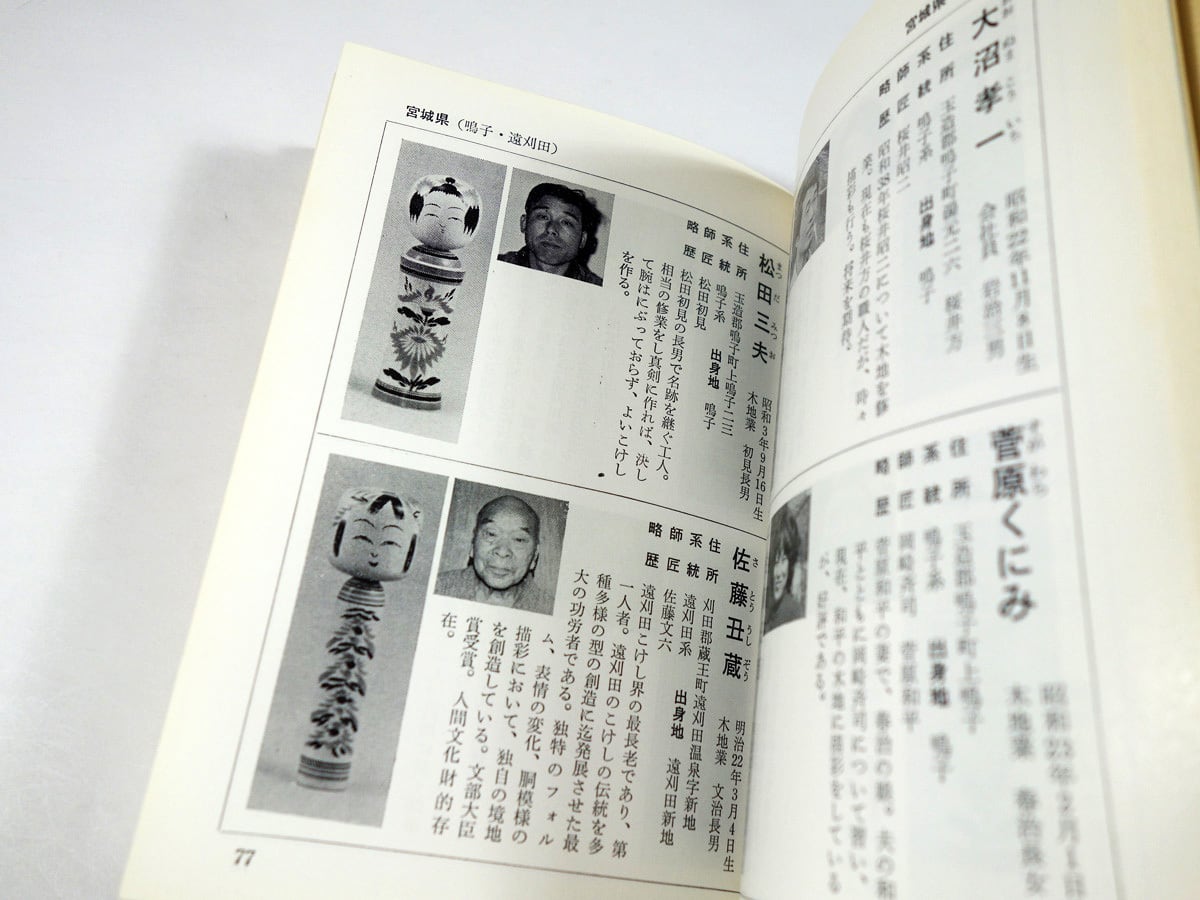 自他ともに「伝統こけし工人」と認める工人260名の代表作、顔写真、略歴、系統図とともに、こけしの基礎知識が掲載されている。巻頭カラー写真4ページ。モノクロ写真・図版、多数掲載。