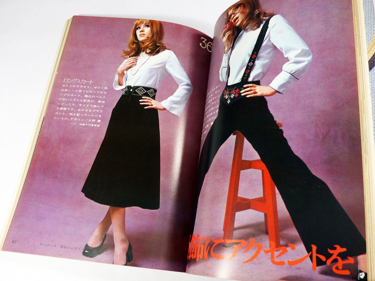 テーブルクロス、ランチョンマット、クッション、ドイリー、バニティケース、レジャーバッグ、パンタロン、ロングスカートなどなど。モデルのメイクやスタイリング、インテリアコーディネートに、1970年代前半の空気が濃厚にただようカラー写真を多数掲載。