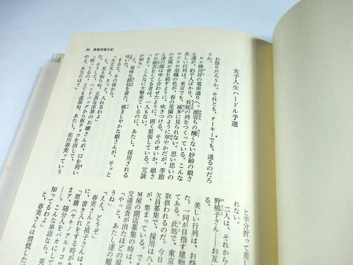 美しい行列は、お祭りでも、ターキー見物でもなかった。一同が目指す建物の入口に、××橋職業紹介所と書いてある。此処で、東京のすべての百貨店の、女店員募集が取り扱われるのだ。今日は、日本橋の有名な昭和デパートの欠員募集で、採用は八十名なのだが、千人近くの娘さんが集まっている。