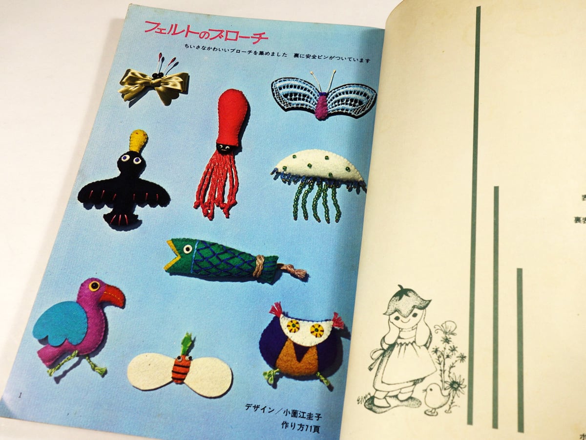 小薗江圭子の「フェルトのブローチ」、わたなべ緑・和田絢子の「ぬいぐるみ人形」などなど。人気作家たちによる、こどものための作品を集めた手芸集。