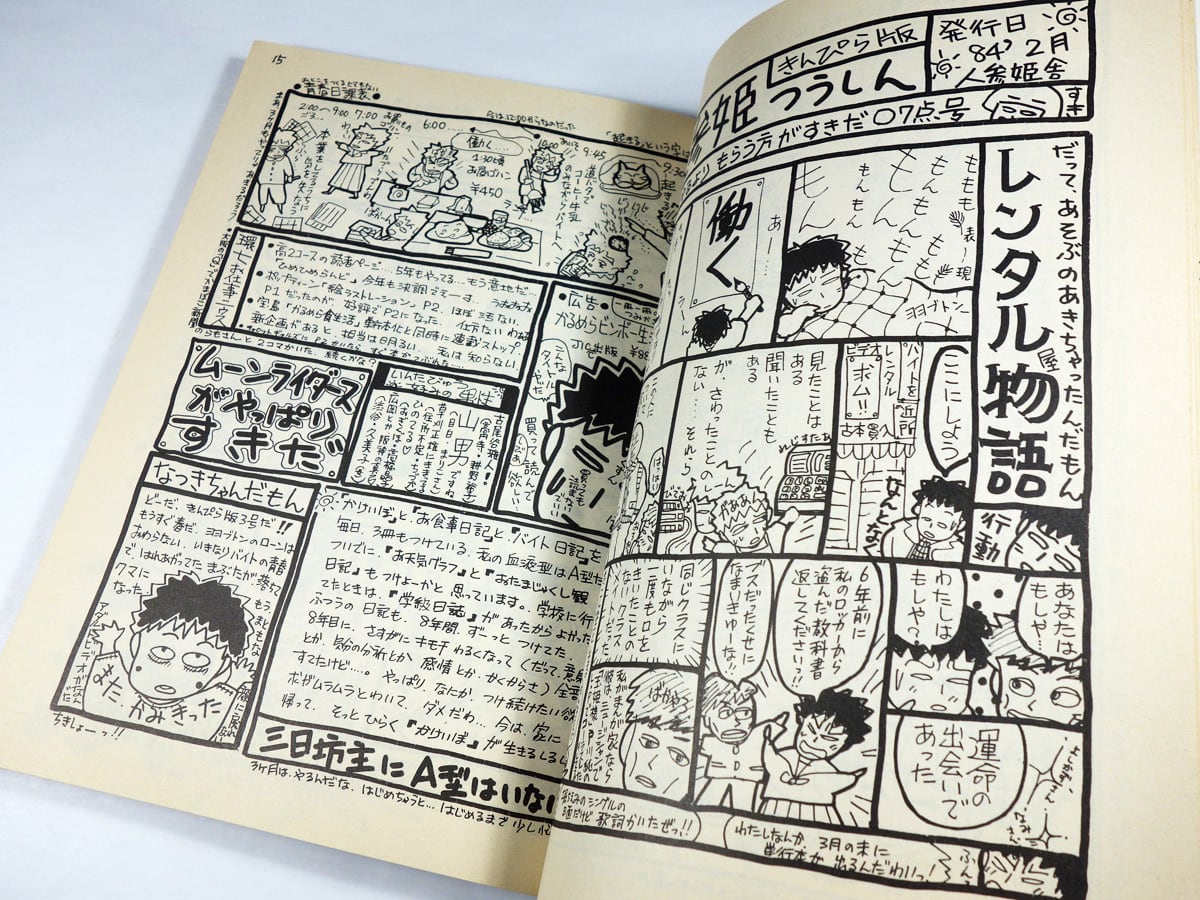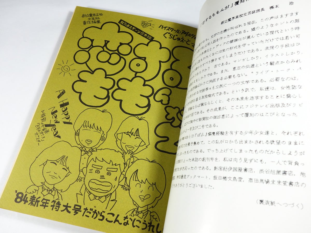 漫画あり、小説あり、詩あり、評論あり、インタビューあり、パロディあり、とじこみ付録あり、なんでもあり。全編手書きによる誌面からあふれだす、80年代の訳のわからない熱量に気圧される。