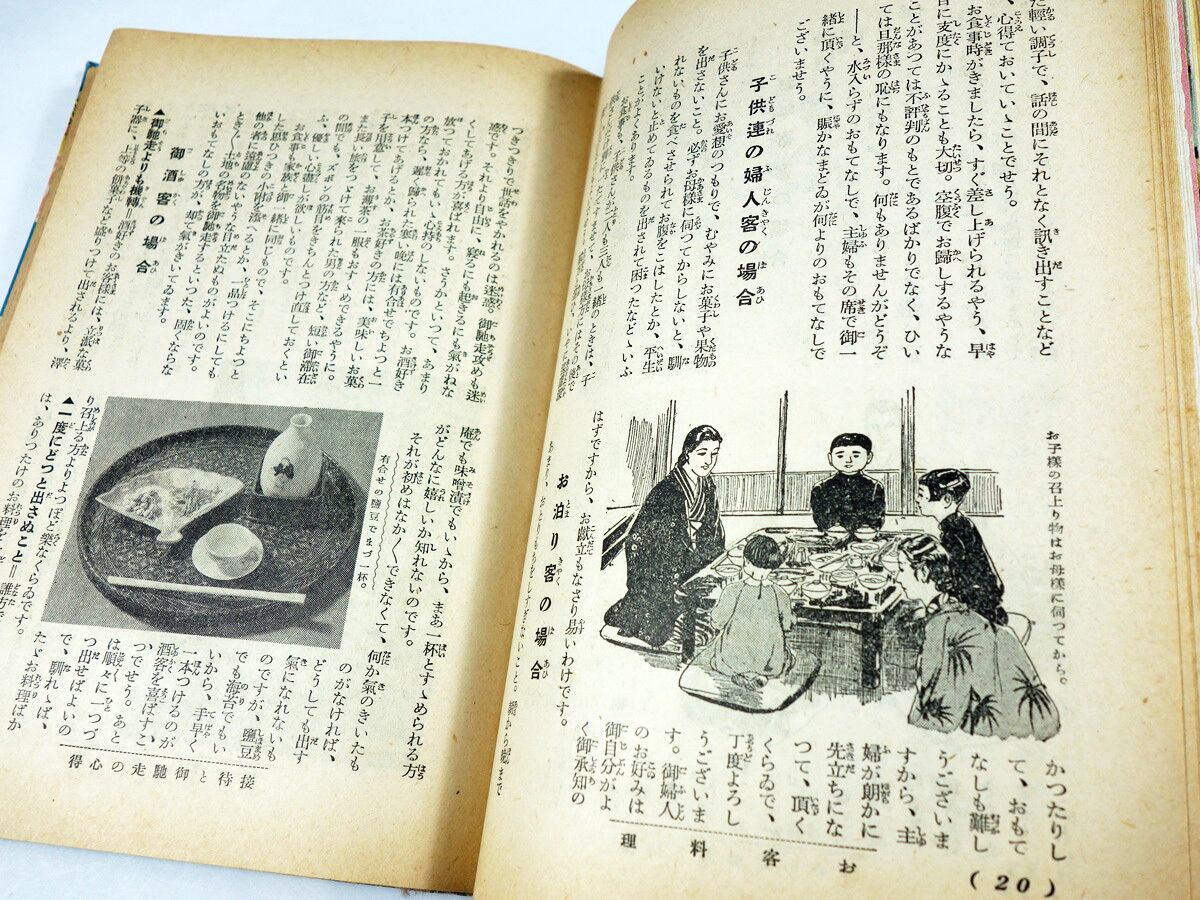 本書のテーマは、「お客料理」。和食の客膳料理を中心に、洋食、中華料理などのおもてなし料理をさまざまに紹介している。冒頭30ページにわたって、お客様をもてなす際の「心得」がこと細かく記されており、具体的な料理の作り方までなかなかたどり着かない。当時の主婦の気苦労はさぞ、と思いやられる。