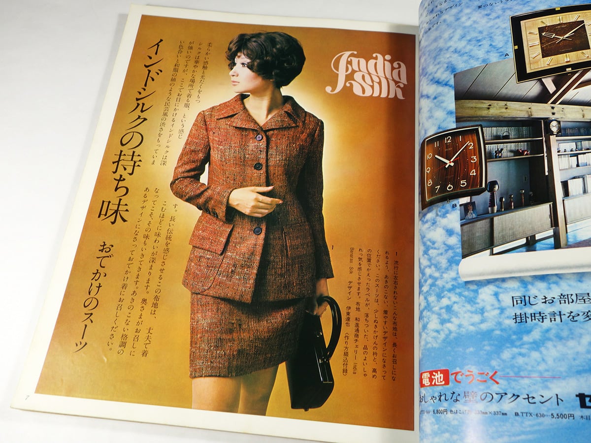 表紙写真は、大倉舜二。サイケデリックなタイトル文字が印象的なファッションページ「インドシルクの持ち味」は、立木義浩が撮影を担当。手芸ページでは、人形作家・和田絢子のファンタジックな作品が誌面を飾っている。