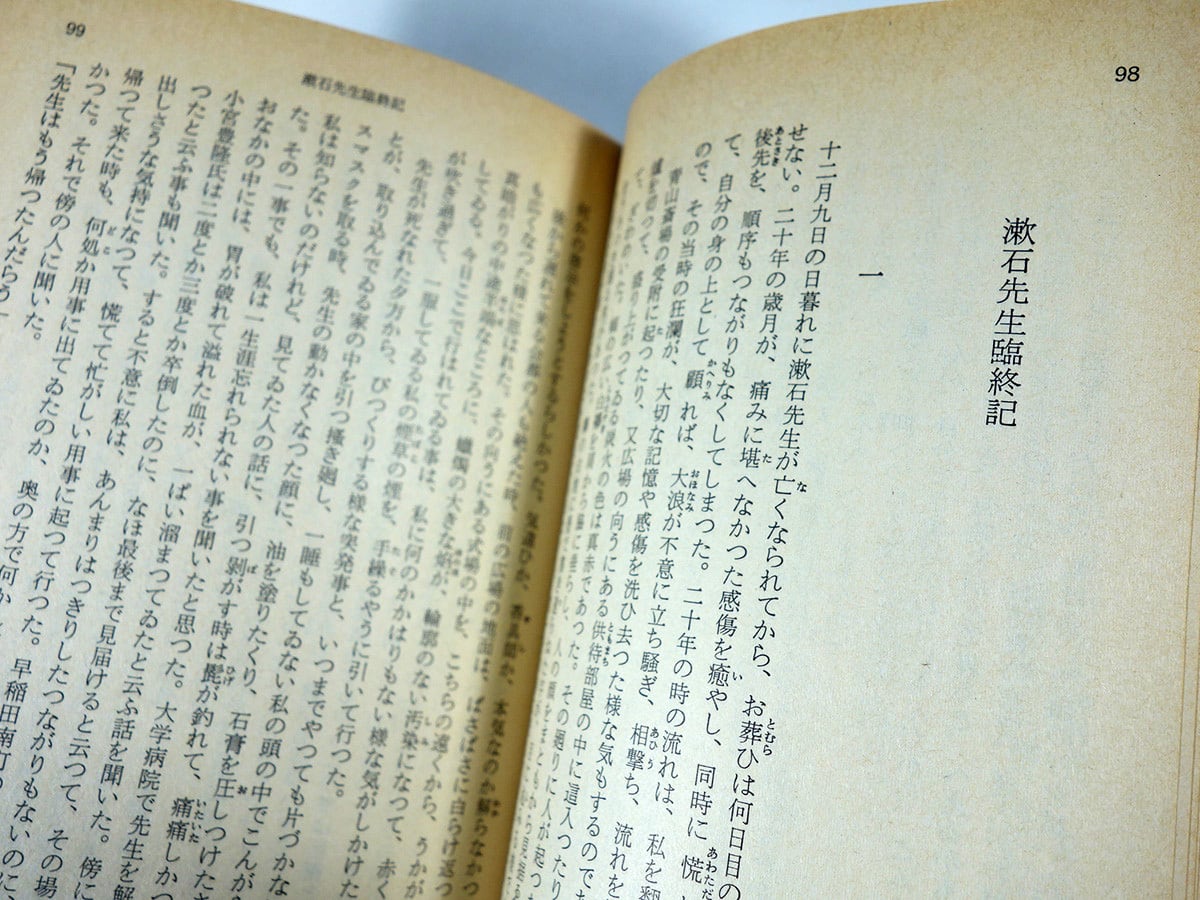 十二月九日の日暮れに漱石先生が亡くなられてから、お葬ひは何日目の幾日であつたかも思ひ出せない。二十年の歳月が、痛みに堪へなかつた感傷を癒やし、同時に慌しかつたその当時の事の後先を、順序もつながりもなくしてしまつた。二十年の時の流れは、私を翻弄する事に急であつて、自分の身の上として顧れば、大浪が不意に立ち騒ぎ、相撃ち、流れを攪した事も幾度かあるので、その当時の狂瀾が、大切な記憶や感傷を洗ひ去つた様な気もするのである。