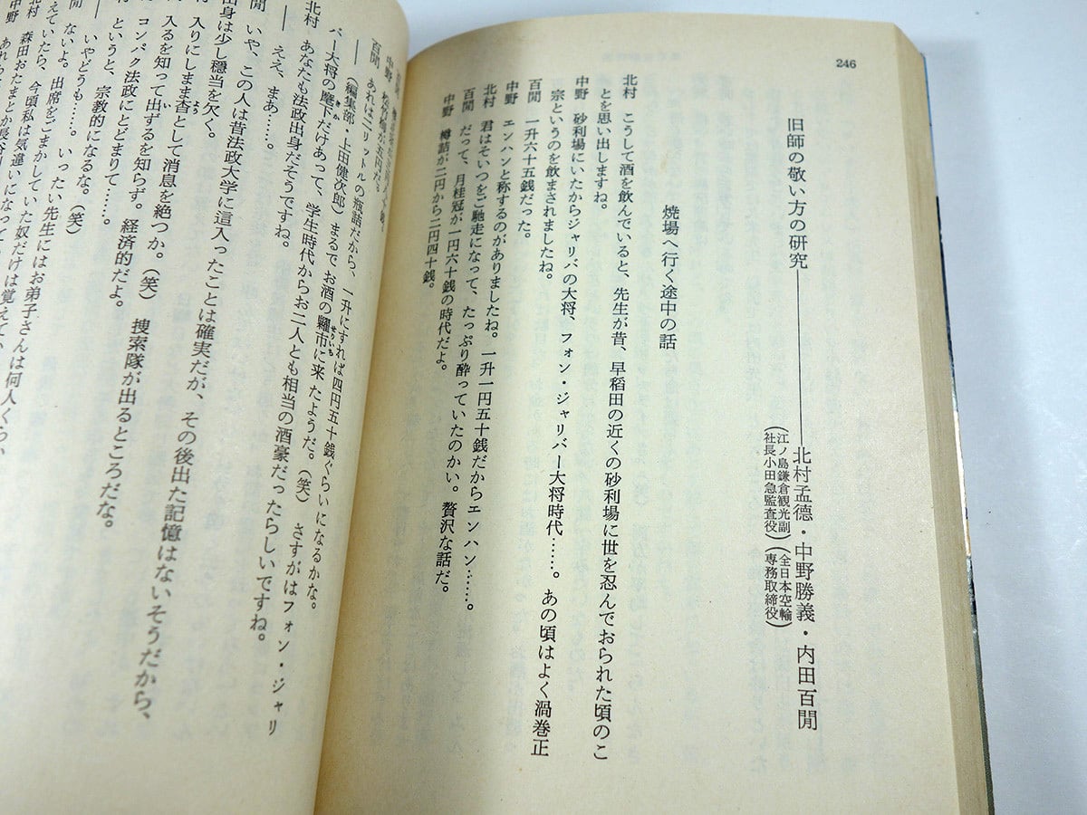 東京駅の駅長、銀座バア・ロマンス店主、最高裁判所長官、三越の重役、全日空の取締役、作家、俳人、箏曲家など、幅広い人脈を駆使して展開された傑作鼎談シリーズ「三盃座談」を併載。