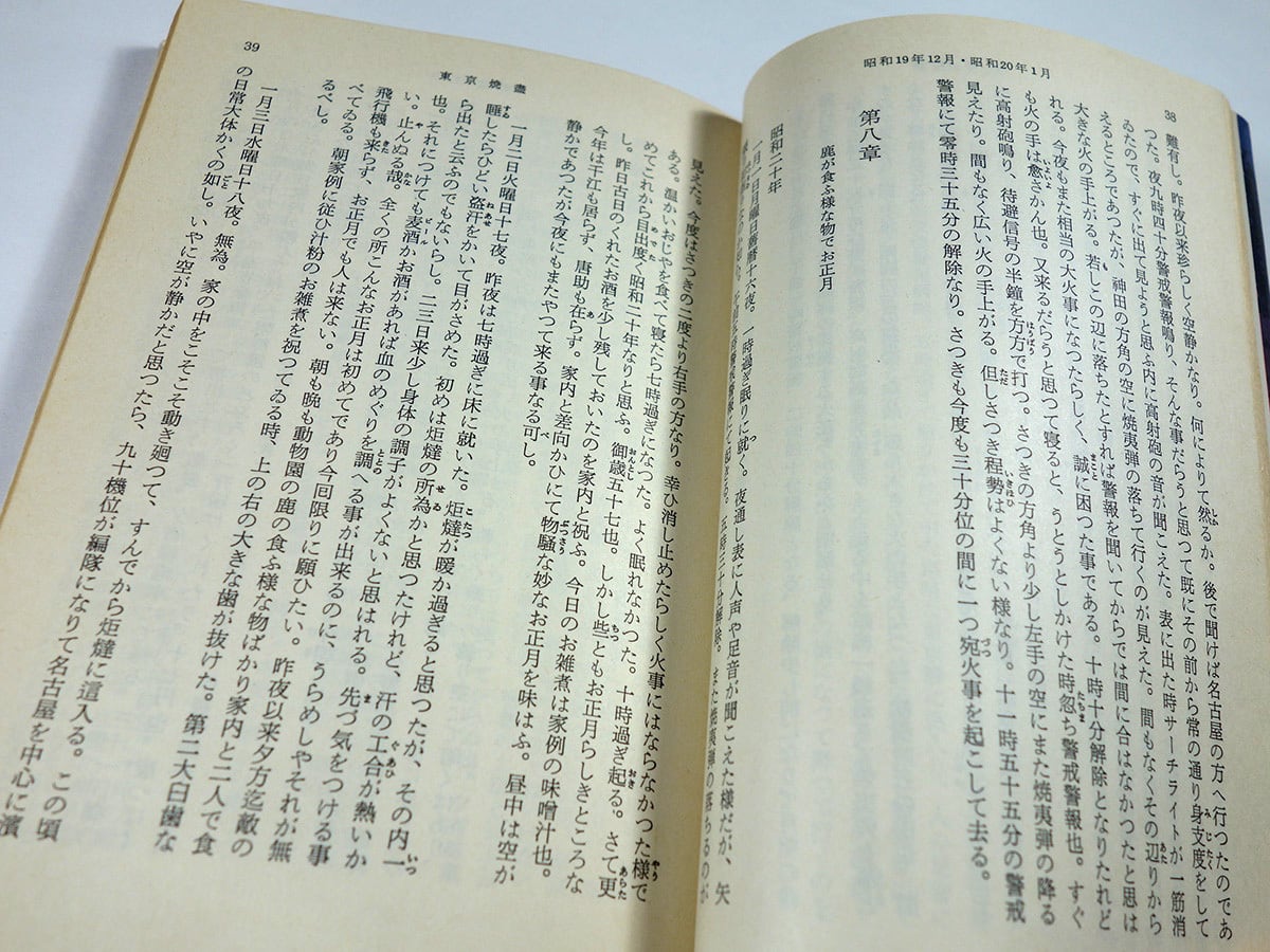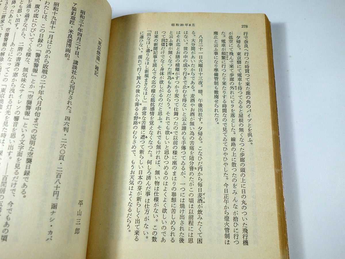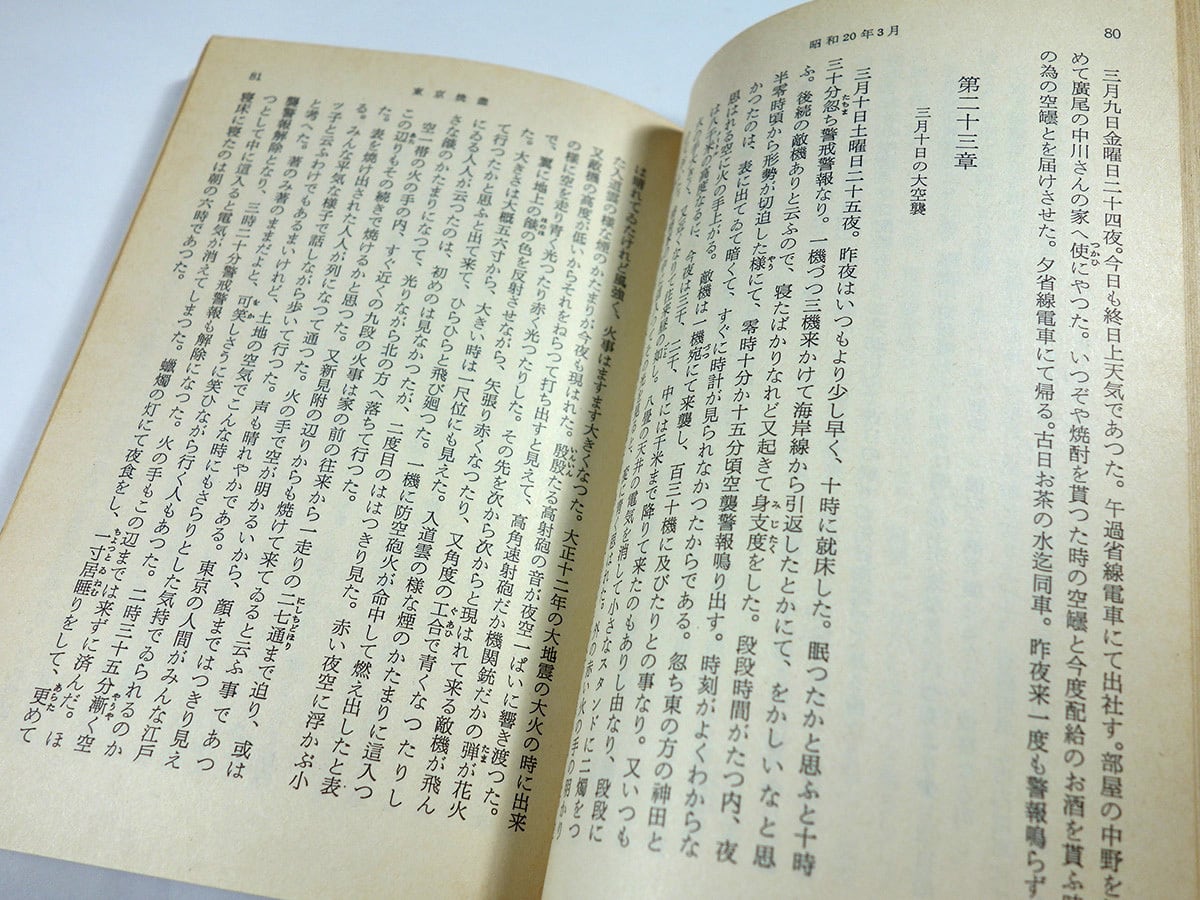 昭和19年11月から昭和20年8月まで、アメリカ軍による激しい空襲によって焼き尽くされてゆく首都の様子を克明に記録した戦中日記。終戦後10年を経て、昭和30年に単行本として刊行された。