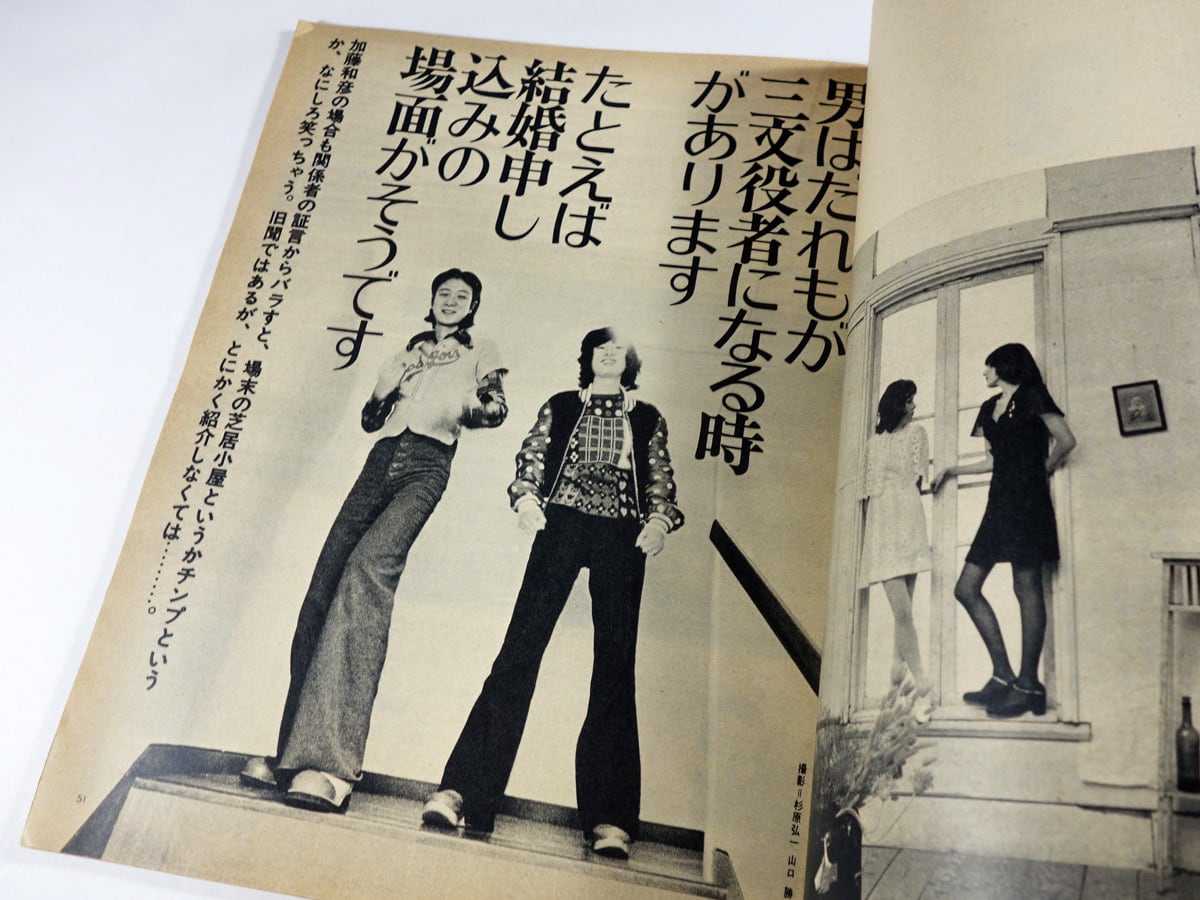 「スキャンダル・その後 加賀まりこの場合」(撮影 立木義浩)、「わが愛するジーンズへの鎮魂曲」(伊丹十三、浅川マキほか)、「男はだれでもが三文役者になるときがあります」(加藤和彦&ミカ)など。